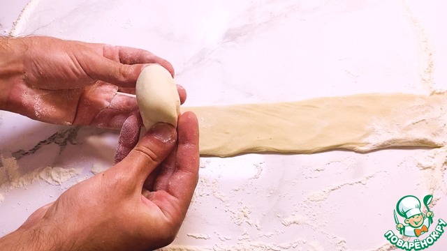 Затем тесто нарезаем на полоски шириной как сосиски.