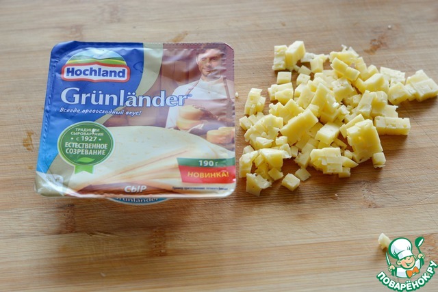 Полутвердый сыр Грюнландер нарежьте мелким кубиком