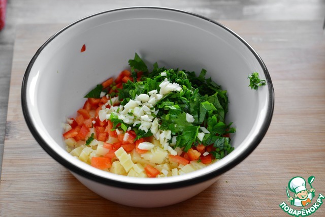К перцу и сыру добавьте нарубленную мелко петрушку и чеснок, перемешайте.