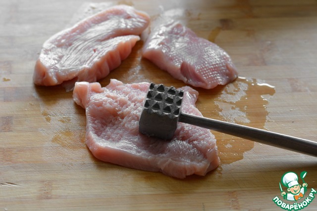 Стейки грудки индейки отбейте до толщины 0,5 см. Посолите по вкусу