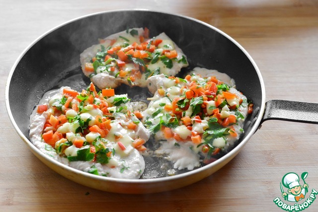 Если готовите на сковороде, то берите антипригарную. Разогрейте её как следует. Обжарьте БЕЗ МАСЛА стейк на одной стороне буквально 30 секунд, переверните, выложите сверху топинг, накройте крышкой, выключите плиту и оставьте на горячей плите на 5-8 минут. За это время вторая сторона стейка приготовится, индейка дойдет до готовности (ведь её толщина всего 0,5 см, ей много не надо), перец слегка приготовится, но останется аль-денте, сыр растает, а петрушка и чеснок выпустят свои ароматы.