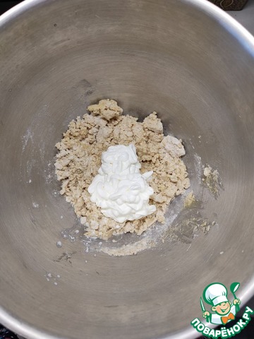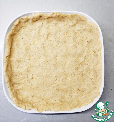 Для теста соединить все сухие составляющие, добавить натертое холодное масло, растереть в крошку. Я использовала вместо масла утиный жир.