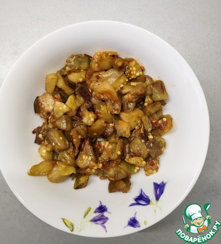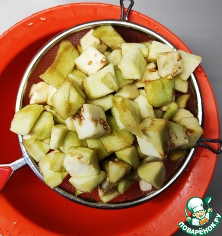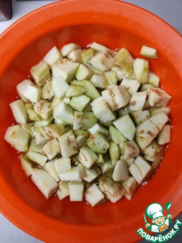 Пока тесто отдыхает, приготовим начинку. Для этого баклажан порежем кубиками, посолим.