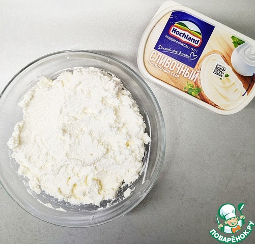 Тщательно смешать творог с плавленым сыром