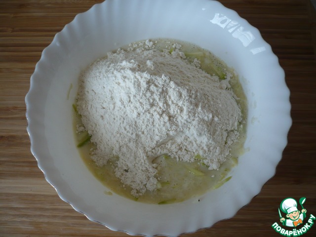 В массу из кабачков влейте молоко и добавьте пшеничную муку. Все хорошо перемешайте.