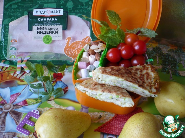 На одну половину кабачковой лепешки положите ломтик ветчины из индейки ТМ "ИНДИЛАЙТ".