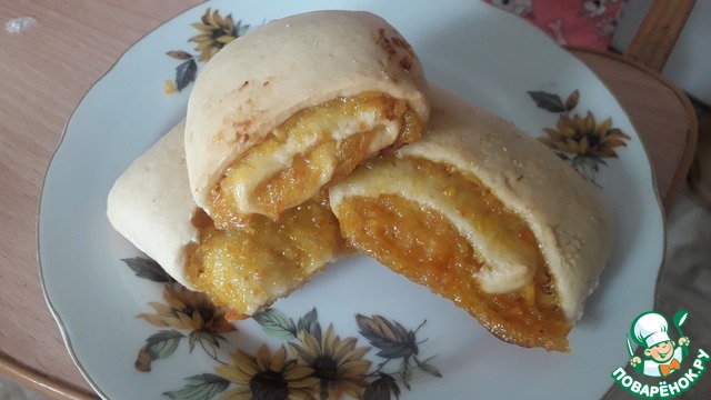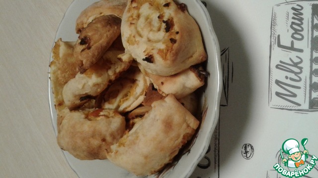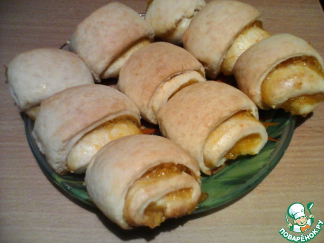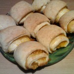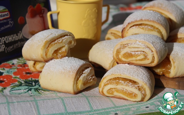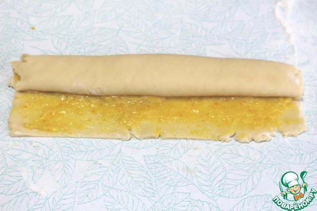 Сделала вывод, что при раскатке лучше делать прямоугольник с соотношением сторон 1:2, иначе получится очень-очень толстый рулет с огромными печеньями. Вначале я положила половину начинки, как в рецепте (довольно толстым слоем), и при выпекании и резке она вылезла. Печенье выглядело очень смешно, особенно по сравнению с красивыми аккуратными рулетиками автора.