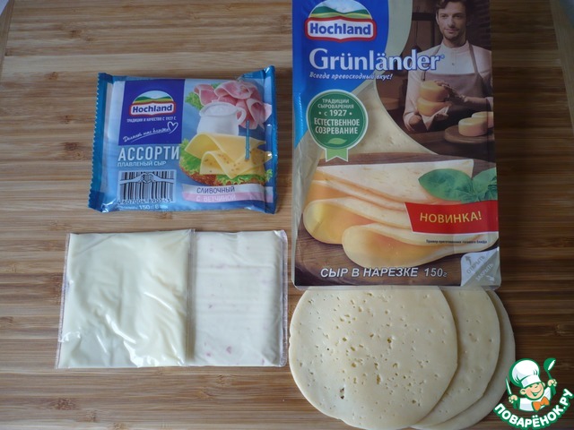 Для начинки хлеба возьмите плавленный сыр ассорти сливочный с ветчиной ТМ "Hochland", также полутвердый сыр в нарезке Грюнландер ТМ "Hochland".