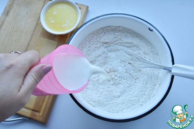 К сухим ингредиентам вливаю теплое молоко.