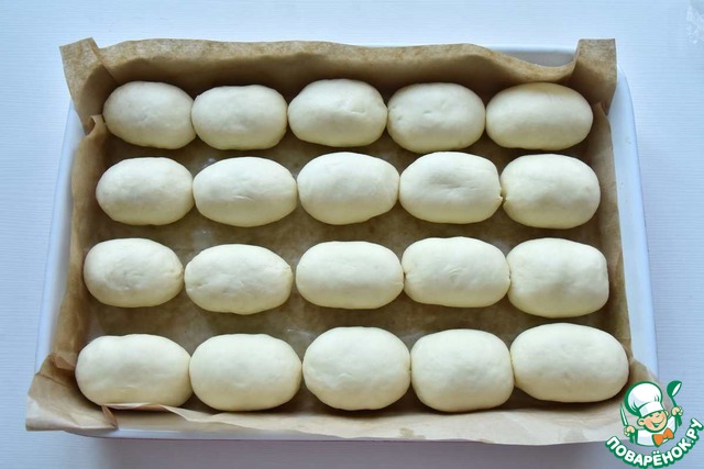 Форму выстилаю пергаментом, слегка смазываю его маслом и выкладываю булочки. Оставляю заготовку пирога, накрыв пленкой, в теплом месте для подъема.