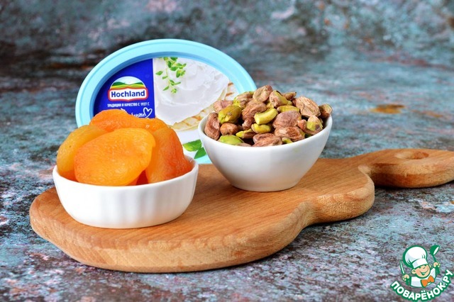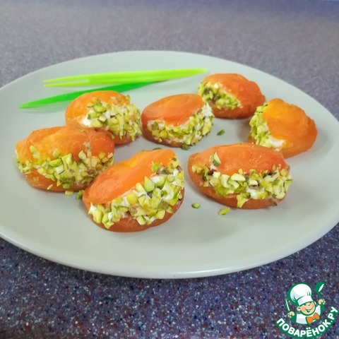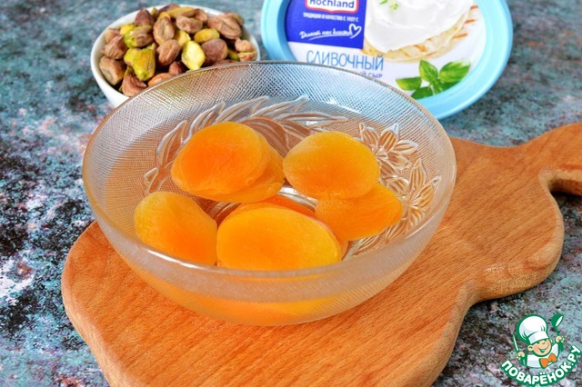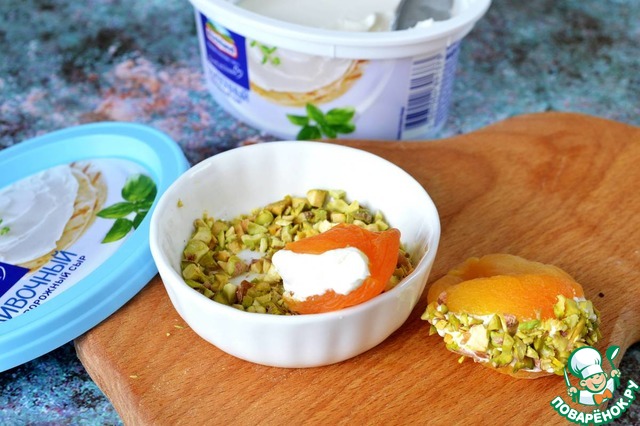 В кураге сделать надрез, вложить в него 1 ч. л. творожного сыра.