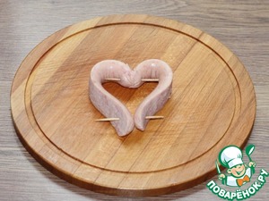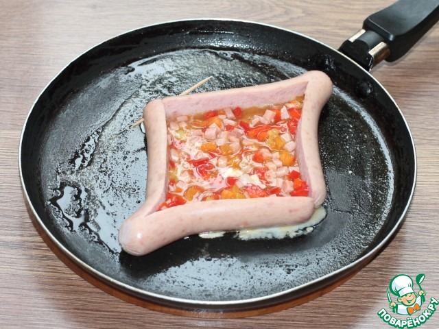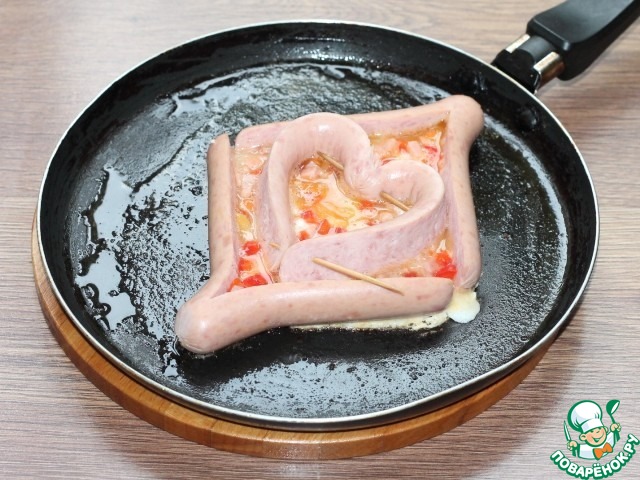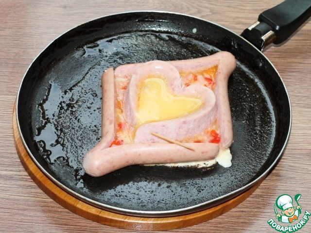 12. И заполняем его желтком. Можно немножко подкрасить сердечко томатом. Готовим блюдо на слабом огне под крышкой.