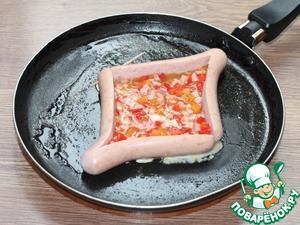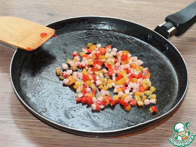 5. На разогретом сливочном масле обжариваем сладкий перец и кусочки колбасы, 1-2 минуты.