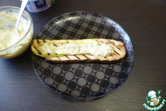 Внахлёст сложить слайсы кабачка и баклажана. Смазать приготовленной сливочно-авокадовой начинкой.