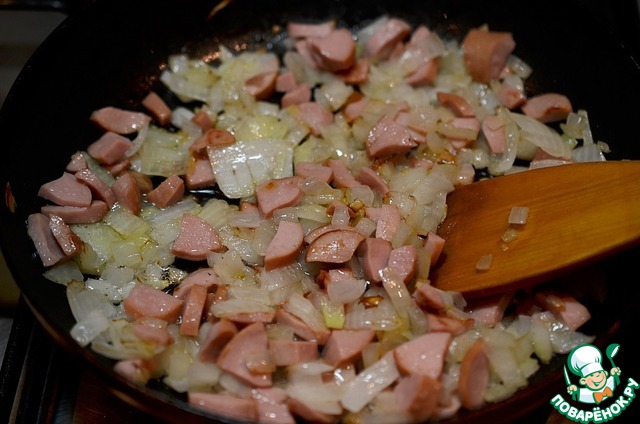 Лук и сосиски нарежьте и обжарьте около 10 минут.