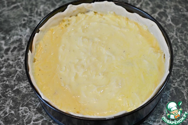 Влейте заливку. Готовьте в разогретой до 200 градусов духовке около 30-40 минут.