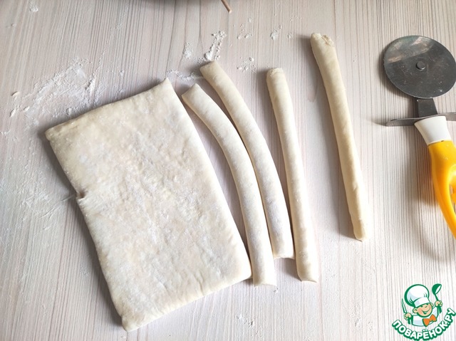 Дрожжевое слоеное тесто нарезать на полоски при помощи роликового ножа шириной примерно 1,2 -1,5 см.