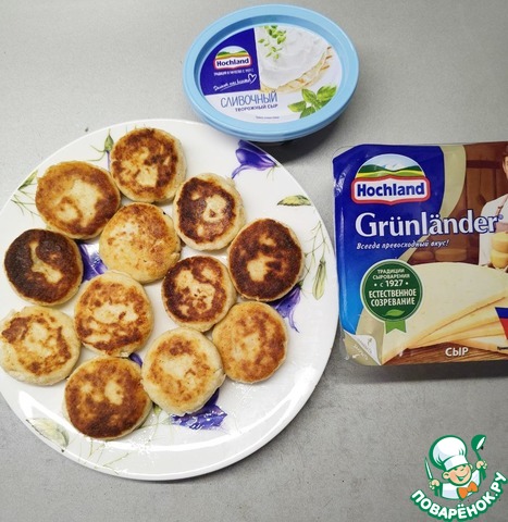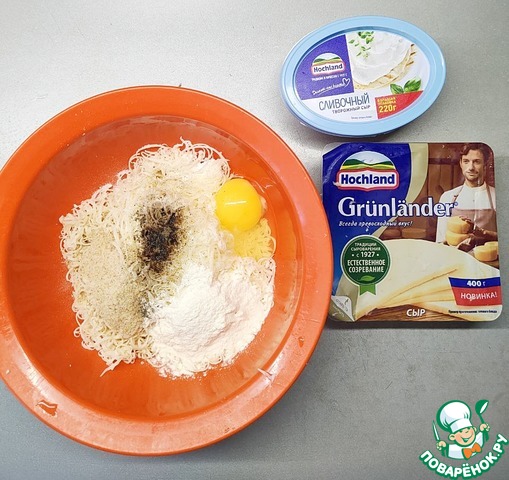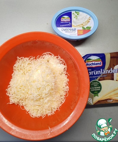 Смешать творожный сыр с натертым полутвердым сыром Грюнландер