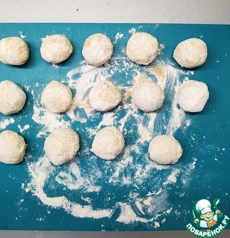 Сырниковую массу разделить на шарики размером с грецкий орех, запанировать в муке, слегка приплюснуть и округлить. Последнюю процедуру очень удобно делать при помощи стакана.