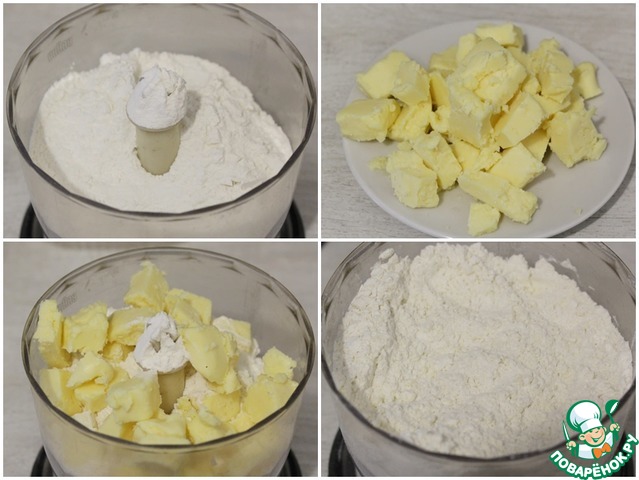 В чашу измельчителя всыпать муку, добавить соль, сахарную пудру и кусочки холодного сливочного масла.