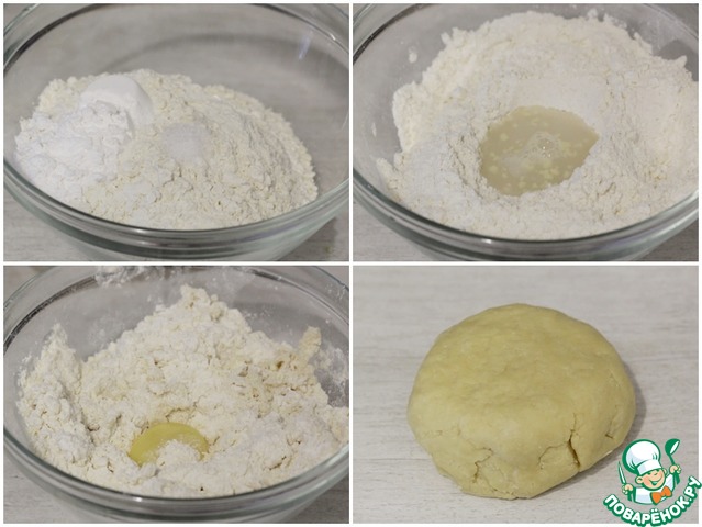 Высыпать крошку в глубокую миску или на стол, сделать посередине углубление, влить туда воду и желток, быстро замесить тесто.