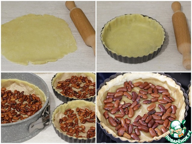 На тесто постелить бумагу для выпечки, поверх бумаги выложить фасоль, горох или специальный груз.