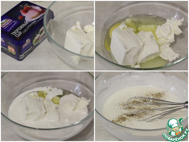 Перемешать до однородной массы, приправить по вкусу солью и перцем. -
