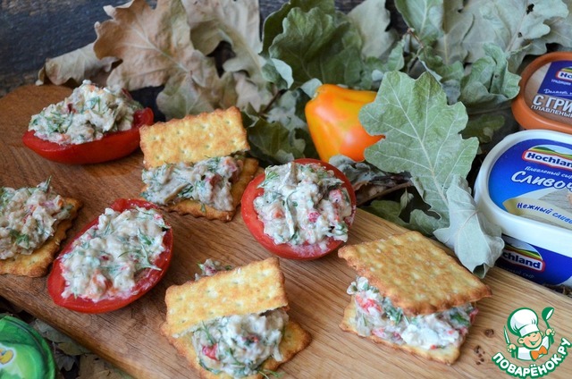 Подавать на ломтике хлеба, батона, крекере, как начинку для помидора.