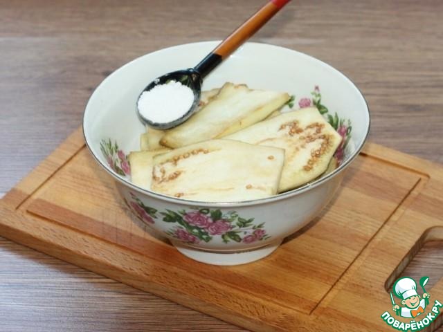 2. Овощи очищаем. Кабачок и баклажан нарезаем тонкими дольками. Баклажан пересыпаем солью и оставляем на 10 минут. Затем промываем и обсушиваем бумажным полотенцем.