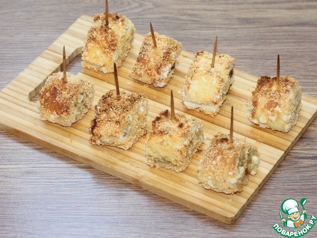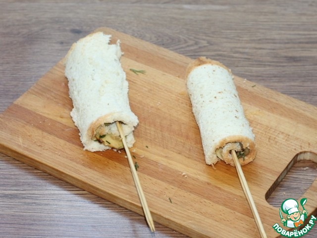 10. Сворачиваем хлебные ломтики рулетом. Край рулета смазываем яйцом. Разрезаем каждый рулет на 4 части и закрепляем зубочисткой.