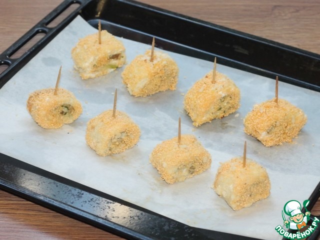 11. Макаем рулетики в муку, затем в яйцо, и в панировочные сухари с измельченными орешками.