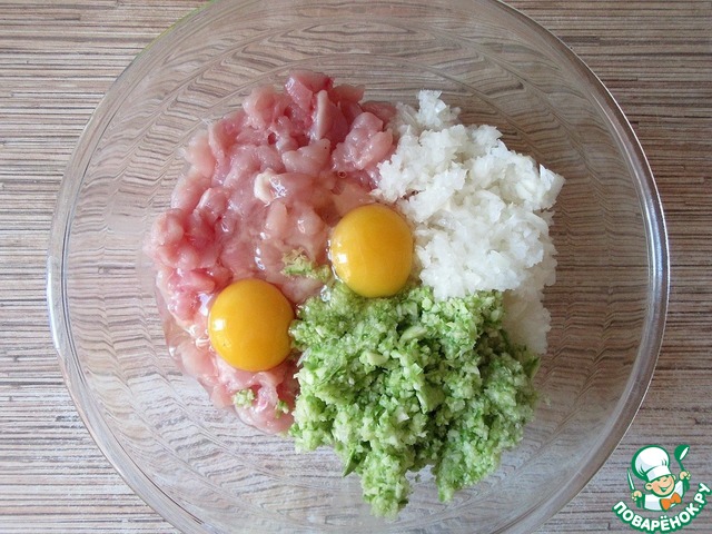 Куриное филе мелко нарезать, добавить тертый или измельченный в блендере кабачок, измельченные лук и чеснок, яйцо (у меня большое, с двумя желтками), перемешать.