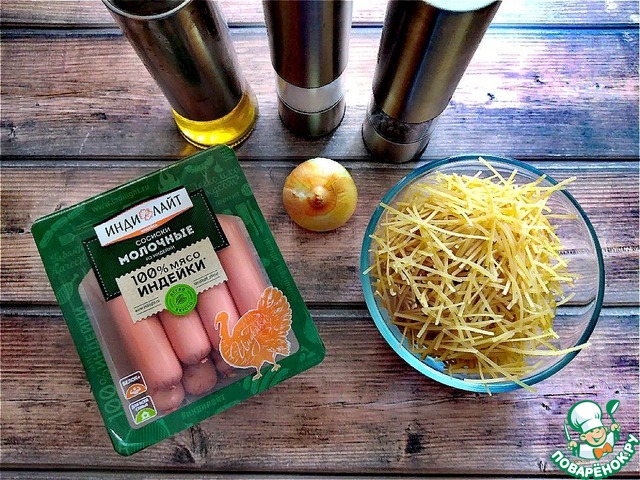 - Масло подсолнечное (рафинированное для обжарки лука и сосисок) — 1 ст. л.