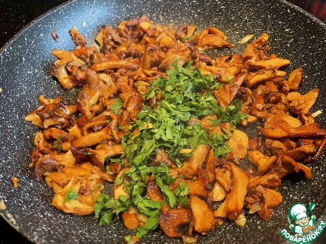 В готовые грибы добавьте рубленную петрушку и перемешайте.