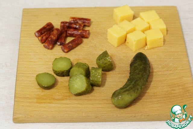 Маринованные огурчики разрезать на 4-6 частей. Кусочки должны быть примерно как сырные кубики или чуть меньше.