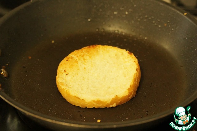 • Булочки разрезать вдоль на две части и подсушить нижние половинки на сухой сковороде или гриле (верхние не понадобятся).