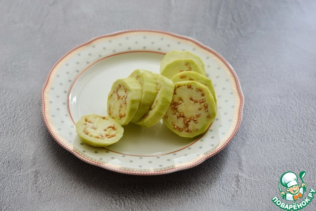• Баклажан очистите от шкурки и нарежьте кружочкам по 1 см