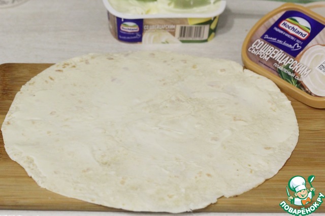 Тортилью намазать плавленным сыром. Мне нравится использовать "Швейцарский", но сюда отлично подойдет и "Сливочный", и сыр с ветчиной.