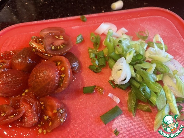 У томатов черри я сняла кожицу. Разрежьте томаты черри пополам, а зелёный лук мелко нарежьте.