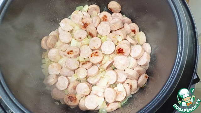 Отправляем в чашу масло, лук и сосиски — Режим «Жарка» 10-12 минут. (Не забываем перемешивать через 3-4 минуты). Желательно готовить как с открытой крышкой.