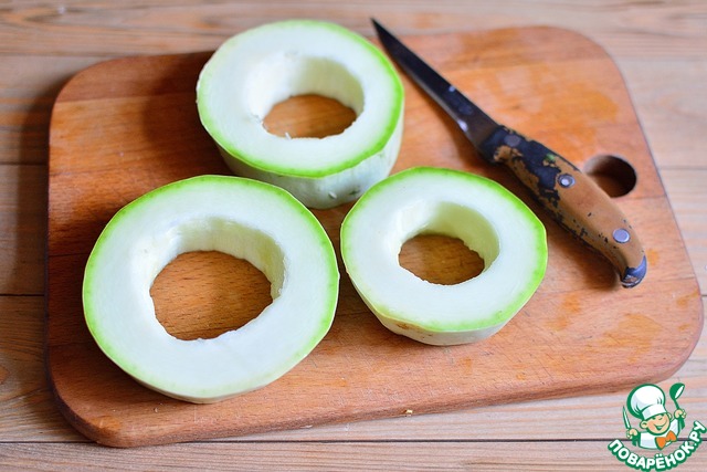 Кабачок порезать на порции вдоль, лучше выбирать тот, что больше диаметром. Вырезать сердцевину.