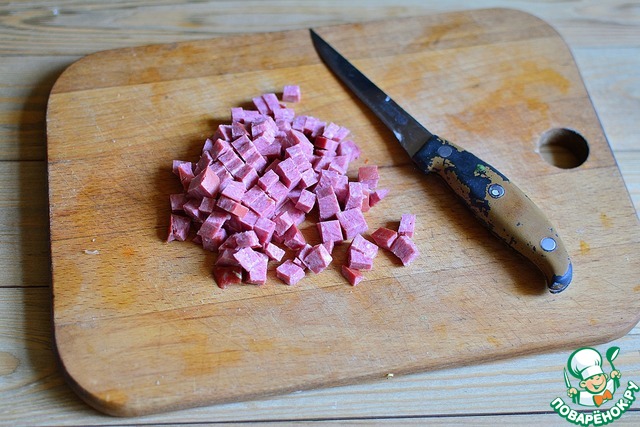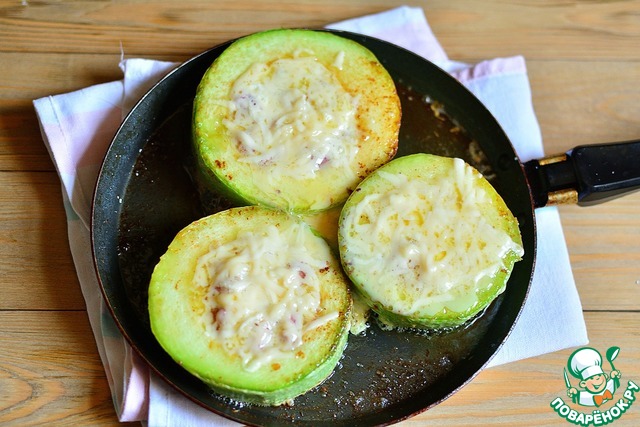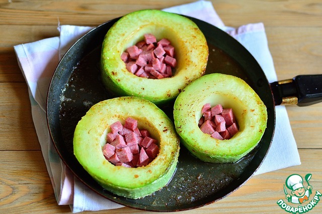 Сначала обжарить кабачок на сливочном масле с обеих сторон до корочки под крышкой. Затем в середину вложить колбасу.