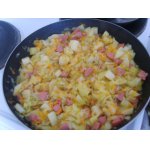 Залить яичной смесью, готовить под крышкой до готовности яиц. Затем посыпать сыром и расплавить его.