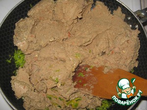 Далее к луку добавляем печень и обжариваем всё вместе.