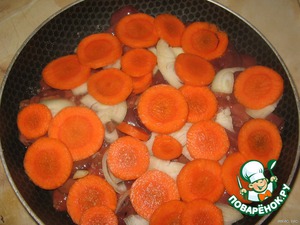 На печень выкладываем лук, нарезанный толстыми полукольцами, и морковь колечками.