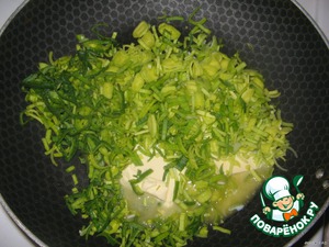 Кладём лук-порей, нарезанный соломкой. Обжариваем его.