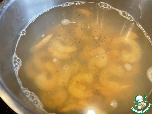 Креветки сварите в подсоленной воде со специями.