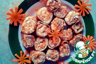 Из блинных лодочек вытащите зубочистки. Подавать закуску из блинов лучше в горячем виде, но и остывшие они тоже вкусные.