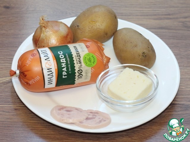 2. Колбасу из индейки, режем кусочками и выкладываем в чашу блендера. Добавляем к колбасе: картофель, жаренный лук, куриный белок и приправу.