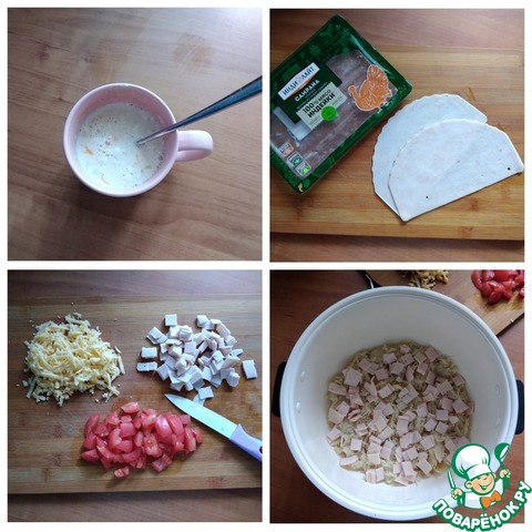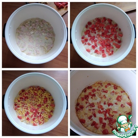 Готовим всё для запеканки. В тёплое молоко разбиваем яйца, солим и добавляем муку. Всё тщательно перемешиваем. Я буду в запеканке использовать ветчину из 100 % мяса грудки индейки ТМ ИНДИЛАЙТ. Возьму 2 ломтика. Нужно их нарезать мелким кубиком. Также мелким кубиком нарезаем помидор. У помидора нужно взять только мясистую часть. У меня помидор розовый и я его порезала весь. Если сочный помидор, то уберите из него мякоть. Она потом вам где-нибудь пригодится. Сыр натёрла на тёрке средней величины. Важно, чтобы сыр был качественным и хорошо плавился, а не твердел. Кастрюлю мультиварки смазываем кисточкой с подсолнечным рафинированным маслом. Можно даже сливочным. Выкладываем на низ вермишель, поверх её - ветчину.